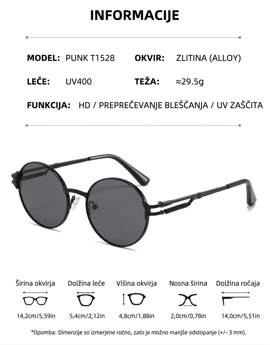 Iščete popolno kombinacijo brezčasnega stila in vrhunske zaščite? Retro okrogla sončna očala model PUNK T1528 prinašajo pridih “steampunk” estetike, ki se poda k vsaki modni izbiri, hkrati pa zagotavljajo brezkompromisno varnost za vaše oči.