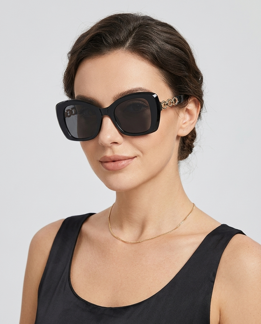 Model sončnih očal SOFIA združuje drzen modni videz z vrhunsko funkcionalnostjo. Širok okvir v stilu “cat-eye” s prefinjenimi zlatimi detajli v obliki verižice na ročkah. Opazili vas bodo ob vsaki priložnosti – na mestnih ulicah ali na plaži.